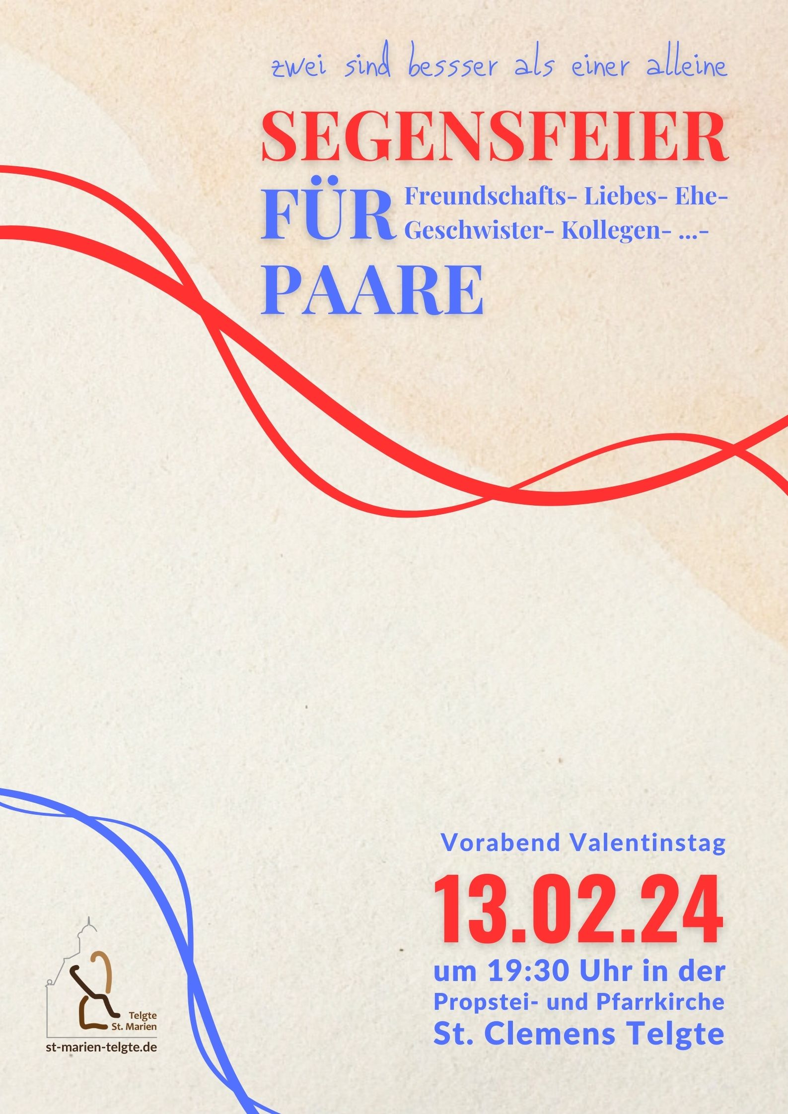 Wir laden Liebes-, Freundschafts- , Geschwister- und weitere Paare ein, sich durch Gottes Wort und Segen stärken zu lassen. Wo Menschen sich vertrauensvoll einander zuwenden und einander verlässlich beistehen, lassen sie die Freundschaft Gottes zu allen Menschen in ihrer Beziehung lebendig werden. Der Paarsegen kann zum Ausdruck des Vertrauens werden, dass Gott uns alles schenkt, was wir für eine gelungene Beziehung zueinander brauchen.