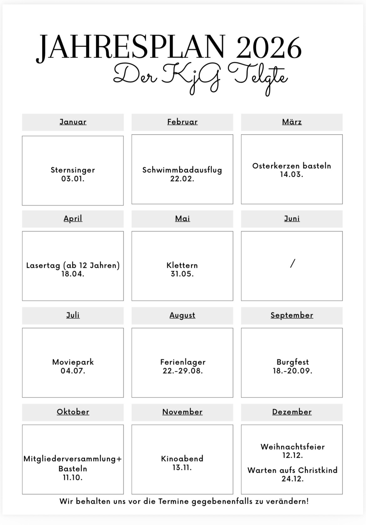 Die KjG ist ein großer Kinder- und Jugendverband, d.h. es gibt in vielen Städten und Gemein- den in Deutschland KjGs. Die KjG Telgte gibt es seit 2012.