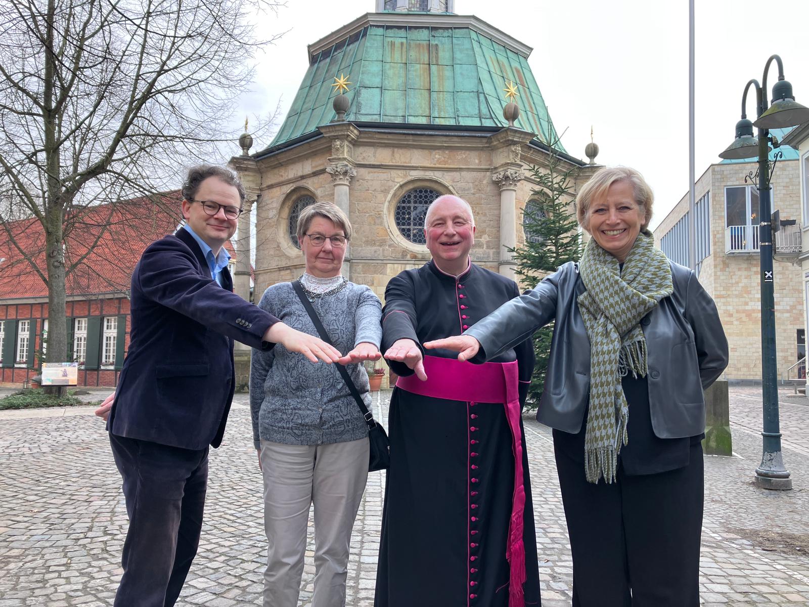 Das neue Leitungsteam vor der Telgter Gnadenkapelle (v. l.): Dr. David Krebes, Rita Stalbold, Propst Dr. Michael Langenfeld und Gerda Engels