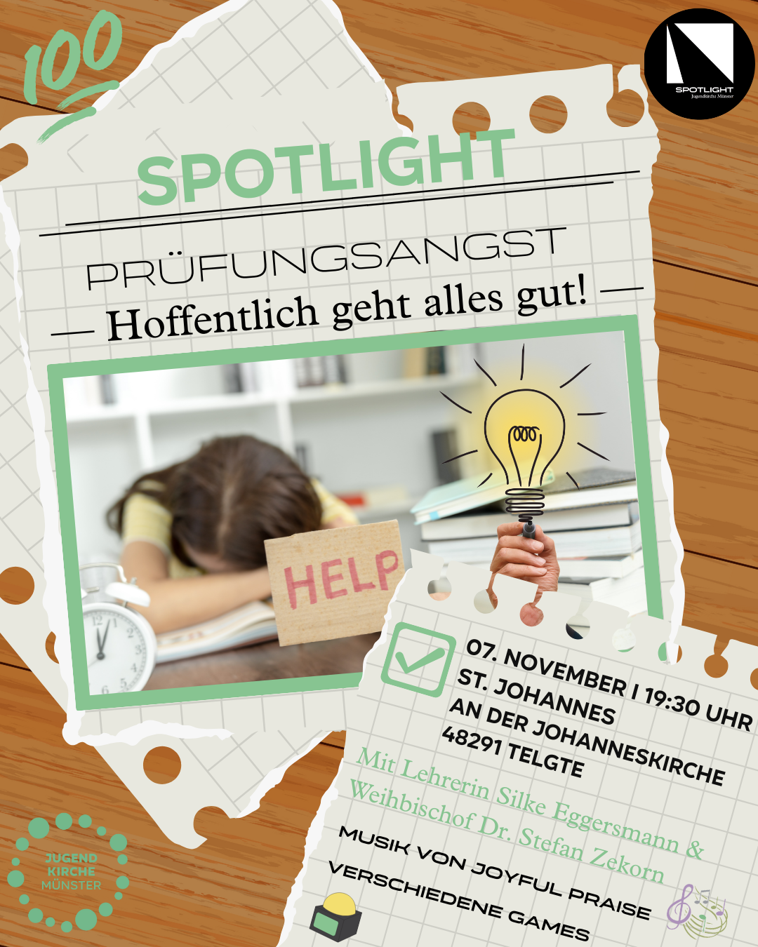 Weihbischof. Dr. Stefan Zekorn, Silke Eggersmann (Lehrerin an der Hildegardisschule in Münster) und Ariana Graf (Psychologische Beratung) reden mit euch am 7. November, ab 19:30 Uhr im Pfarrheims St. Johannes über das Thema "Prüfungsangst".